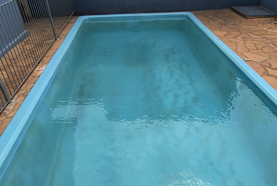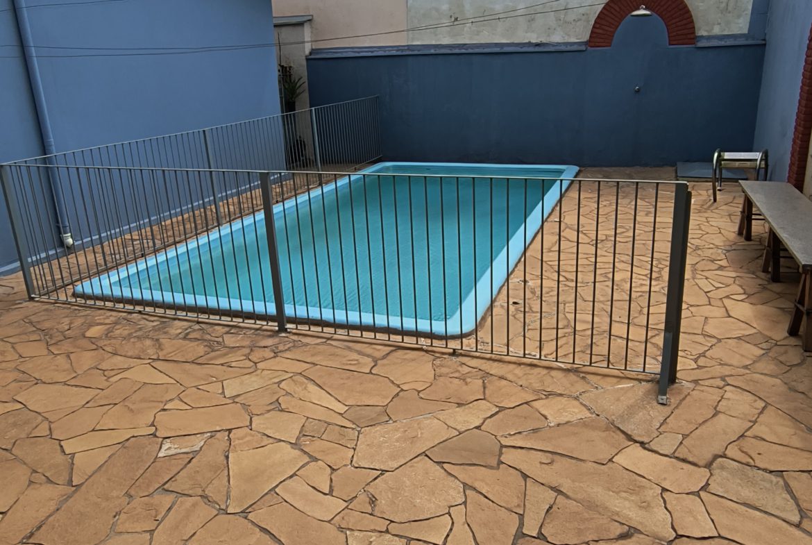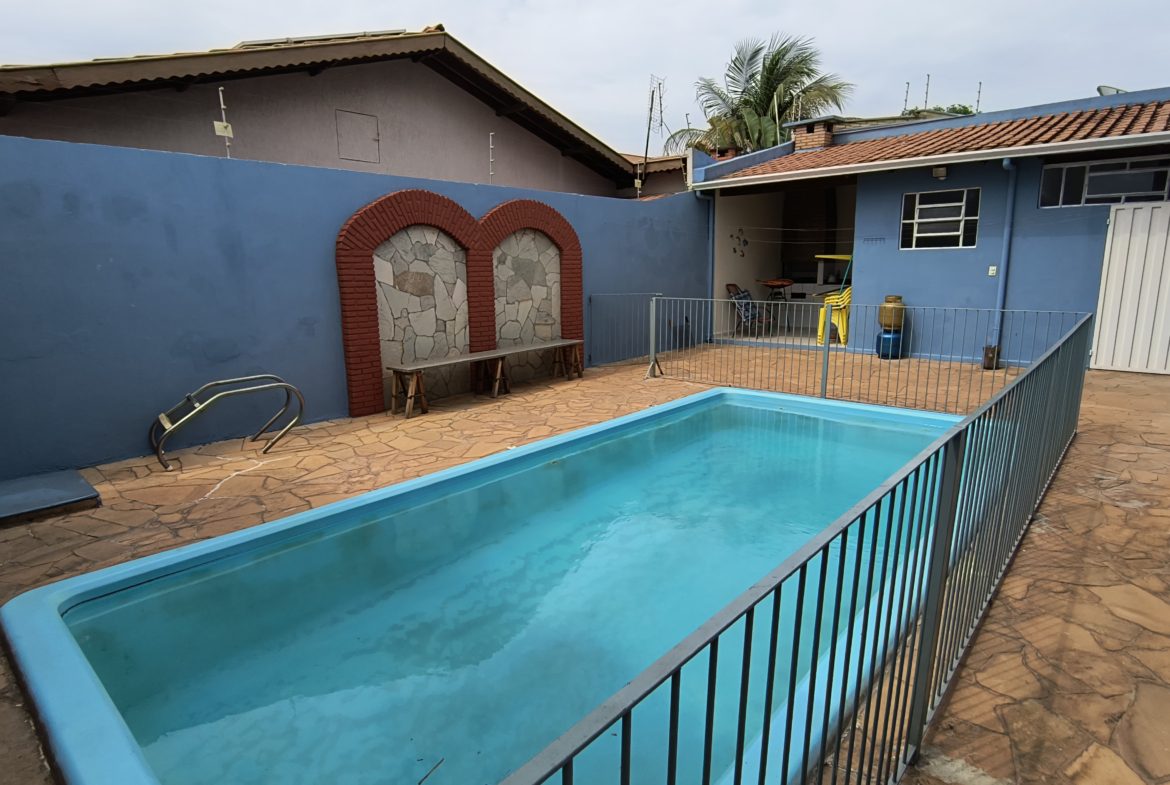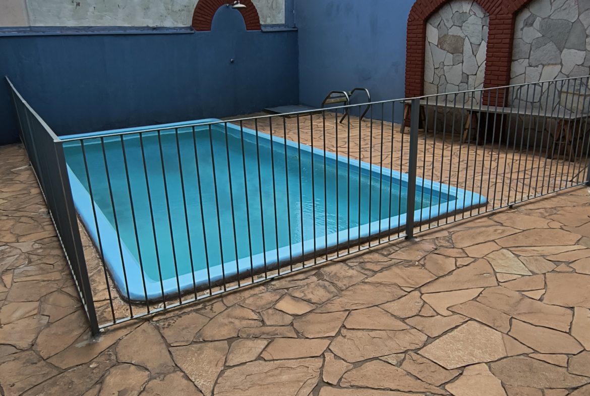 Área de lazer completa: piscina (cercada) e churrasqueira